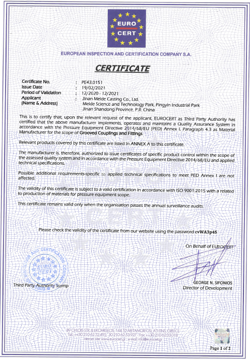MEIDE GROUP Notification of CE Certificate Renewal of Grooved Products