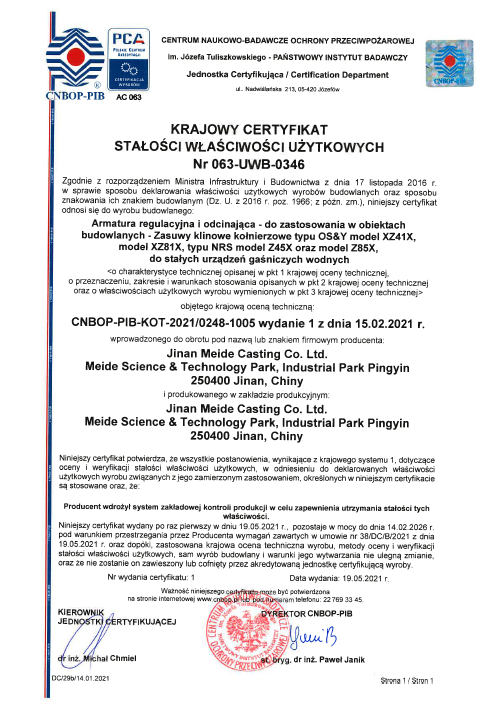 MEIDE GROUP's Gate valve products XZ41X、XZ81X、Z45X、Z85X have been approved by CNBOP, Poland.