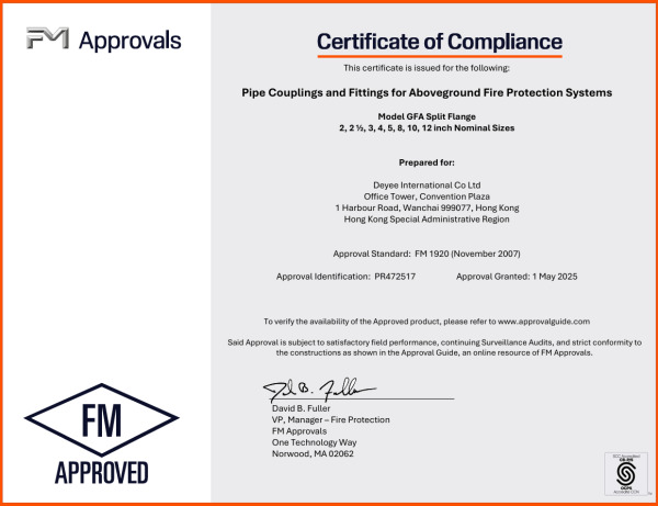 Meide Group's GFA Grooved Flange Fittings in sizes 2, 2 ?, 3, 4, 5, 8, 10, and 12 are FM approved