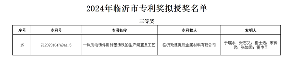 近日,臨沂市市場監(jiān)督管理局發(fā)布《2024年度臨沂市專利獎擬授獎項目公示》信息,臨沂玫德庚辰金屬材料有限公司的專利項目“一種風(fēng)電鑄件用球墨鑄鐵的生產(chǎn)裝置及工藝”榮獲臨沂市專利獎三等獎。這一榮譽不僅是對玫德庚辰在技術(shù)創(chuàng)新領(lǐng)域上的肯定,也是對公司研發(fā)實力和創(chuàng)新能力的高度認可。
