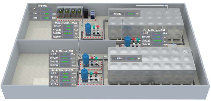 系統對泵房運行態(tài)勢、門禁狀態(tài)和視頻監(jiān)控三維可視化管理,實現泵房全方位管控。通過系統可以全面監(jiān)測泵房各項指標數據,確保供水系統穩(wěn)定運行。對采集的海量數據進行深度處理和分析,實現泵房潛在故障及時預警。系統可以實時對供水數據進行監(jiān)控,實現錯峰調蓄??蓪⒈梅康臍v史數據和運行情況進行展示,為管理者決策提供精準的數據支持,同時當系統監(jiān)測到泵房異常時,會自動智能識別并發(fā)出警報,使運維人員快速響應,減少事故損失,實現風險快速感知、一站調度,及時解決問題。
