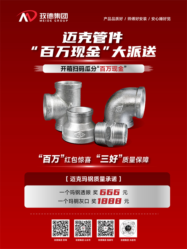 即日起,凡購買玫德集團邁克牌瑪鋼、溝槽管件,有機會參與開箱掃碼瓜分 “百萬現(xiàn)金” 活動!