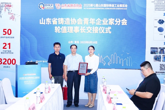 濟(jì)南科德智能科技有限公司總裁劉少云參加山東省鑄造協(xié)會(huì)青年企業(yè)家分會(huì)第四次代表會(huì)議,并當(dāng)選為本屆輪值理事長,展現(xiàn)了玫德集團(tuán)在行業(yè)中的領(lǐng)導(dǎo)地位。