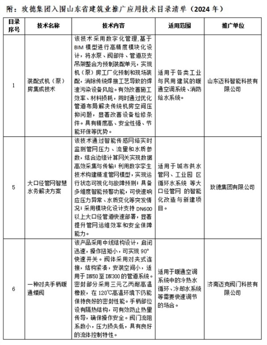 近日,山東省住房和城鄉(xiāng)建設(shè)廳發(fā)布了《山東省建筑業(yè)推廣應(yīng)用技術(shù)目錄(2024年度)》, 玫德集團(tuán)旗下玫德集團(tuán)有限公司、濟(jì)南邁克閥門科技有限公司、山東邁科智能科技有限公司各有1項(xiàng)成果入選;其中《大口徑管網(wǎng)智慧水務(wù)解決方案》成為山東省住建廳重點(diǎn)選取的有引領(lǐng)性、示范性和產(chǎn)業(yè)帶動(dòng)作用的標(biāo)志性成果之一。此次征集聚焦居住品質(zhì)提升、綠色低碳等重點(diǎn)領(lǐng)域,涵蓋新技術(shù)、新材料、新工藝、新產(chǎn)品,全省共遴選出36項(xiàng)成果。