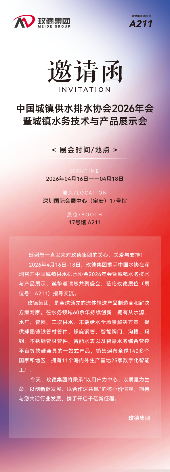 中國城鎮(zhèn)供水排水協(xié)會(huì)2026年會(huì)暨城鎮(zhèn)水務(wù)技術(shù)與產(chǎn)品展示|玫德集團(tuán)誠邀您共聚盛會(huì)!