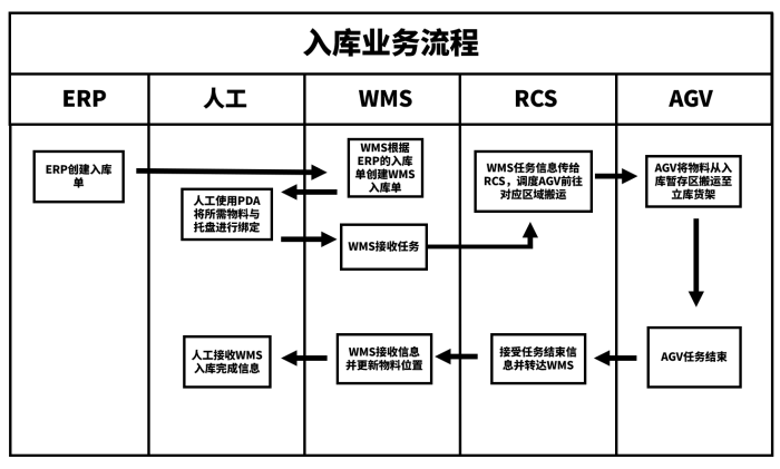 1.貨物到貨后,人工對貨物進行檢驗,檢驗合格后人工下發(fā)物資入庫任務。